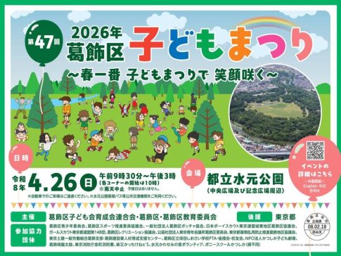 「葛飾区子どもまつり」が、2026年も開催! 毎年人気の「葛飾区子どもまつり」が、2026年4月26日(日)水元公園で開催されることになりました!今年は、約30の体験コーナーやステージイベントが開催されます。きっと、親子...