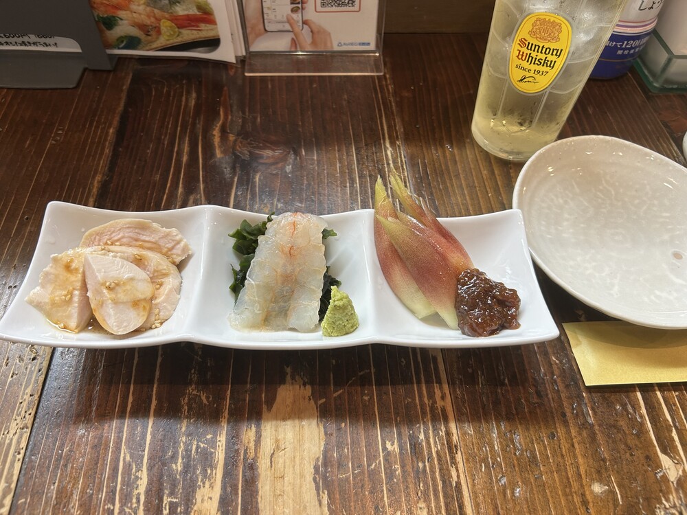 さて、さっそく料理を注文しようとしたところ、「お通しは甘えびのつかみ取りと小鉢3種のどちらにしますか?」と店員さんに聞かれました。