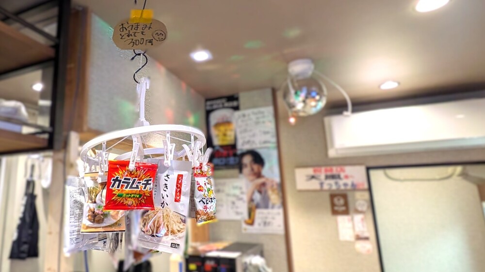 さらに目線を上げると、天井から洗濯物のようにぶら下がるスナックたち。ポンと取りたくなる遊び心です。