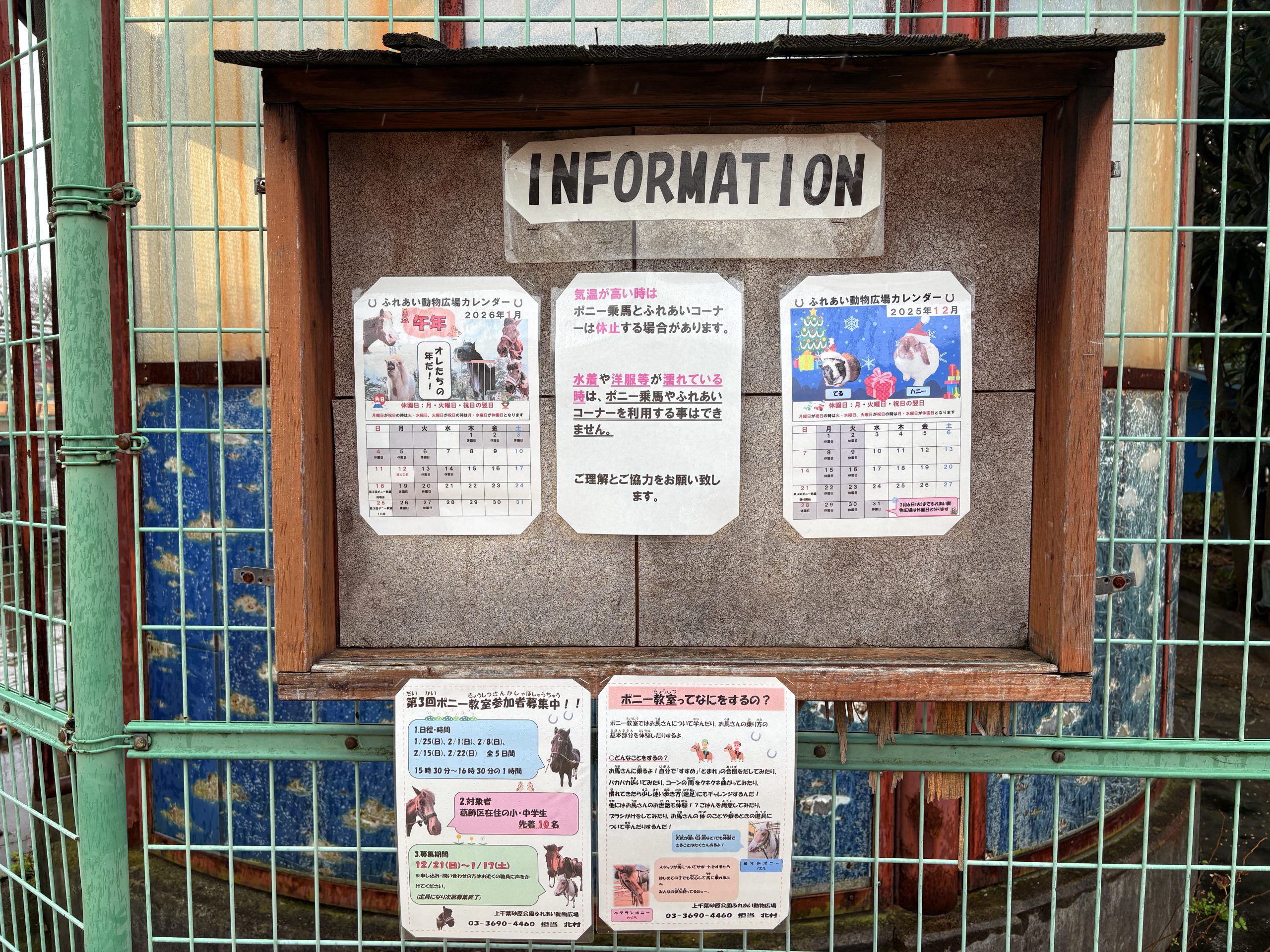 ふれあい広場の入り口付近に、インフォメーションがあり、ポニー教室の案内も掲示されていました。